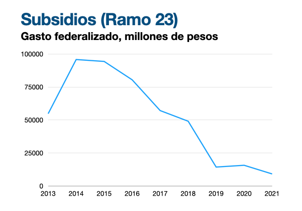 Por su naturaleza los subsidios (o Ramo 23) son gastos que son difíciles de fiscalizar, por lo que resulta más sencillo desviar recursos o hacer compras a precios fuera de mercado. La reciente decisión del Gobierno Federal ha sido disminuir el gasto a través de este tipo de instrumentos, lo que ha causado molestia en los gobiernos estatales, cuando en realidad es un rubro que sólo representa el 1% del gasto federalizado, por lo que no afecta en gran medida los recursos que reciben los estados.