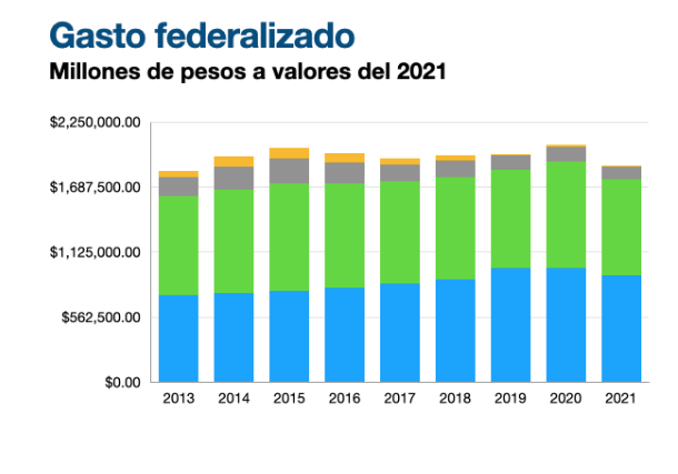 El porcentaje que representa cada uno de esos rubros del total del gasto federalizado está representado en la siguiente gráfica: