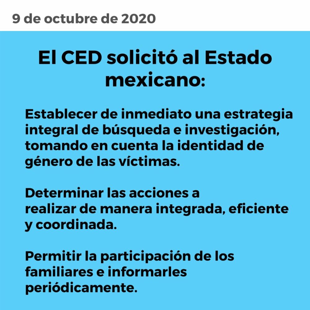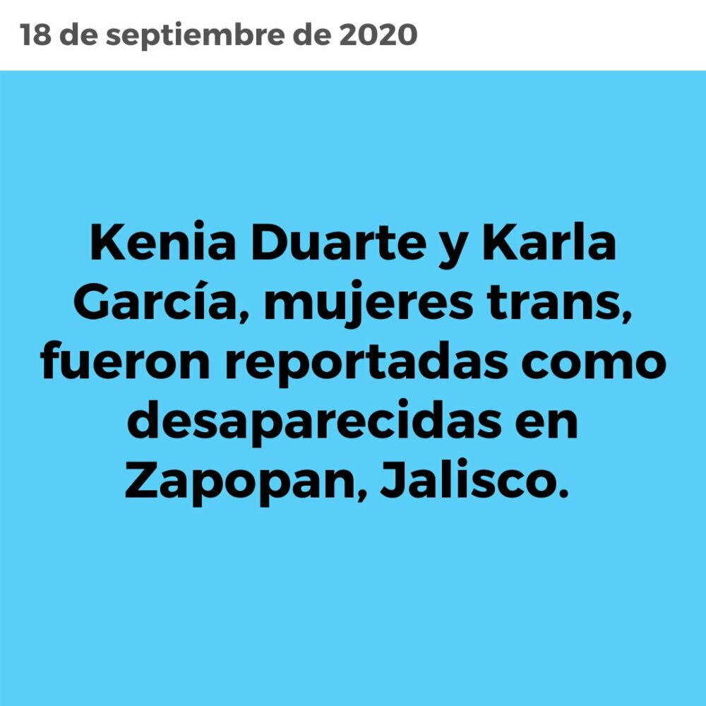 El pasado 23 de octubre se cumplió la fecha límite que tenía el Estado Mexicano para atender con diligencia las acciones urgentes demandadas por el Comité contra las Desapariciones Forzadas (Comité CED) de las Naciones Unidas; las cuales, pretenden que el Gobierno de México en sus tres niveles responda sobre su proceder en la investigación y búsqueda de Kenia Duarte Pérez y Karla García Duarte, mujeres trans desaparecidas el pasado 18 de septiembre de 2020, en Jalisco.
