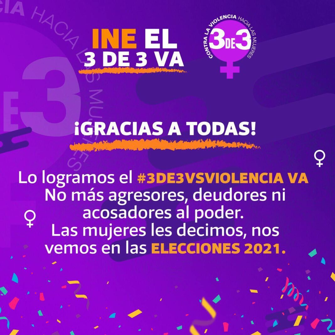 Las Constituyentes CDMX Feministas han impulsado desde el 2018 la iniciativa 3 de 3 Contra La Violencia Hacia Las Mujeres que pretende visibilizar y combatir las violaciones cometidas por razón de género dentro de las propias instituciones públicas; dos años después, este 28 de octubre de 2020, gracias al empuje y fuerza de las redes feministas, el Instituto Nacional Electoral (INE) finalmente aprobó la inclusión de los criterios propuestos en esta iniciativa.