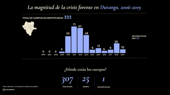 Entre abril de 2011 y 2012, los años de más profunda violencia en Durango, se encontraron fosas clandestinas en casas sin habitar, predios ejidales y lotes abandonados, donde fueron exhumados 383 cadáveres; 26 eran de mujeres. Las retroexcavadoras que usó el Estado para sacarlos de la tierra desmembraron a los cuerpos e imposibilitaron su identificación.