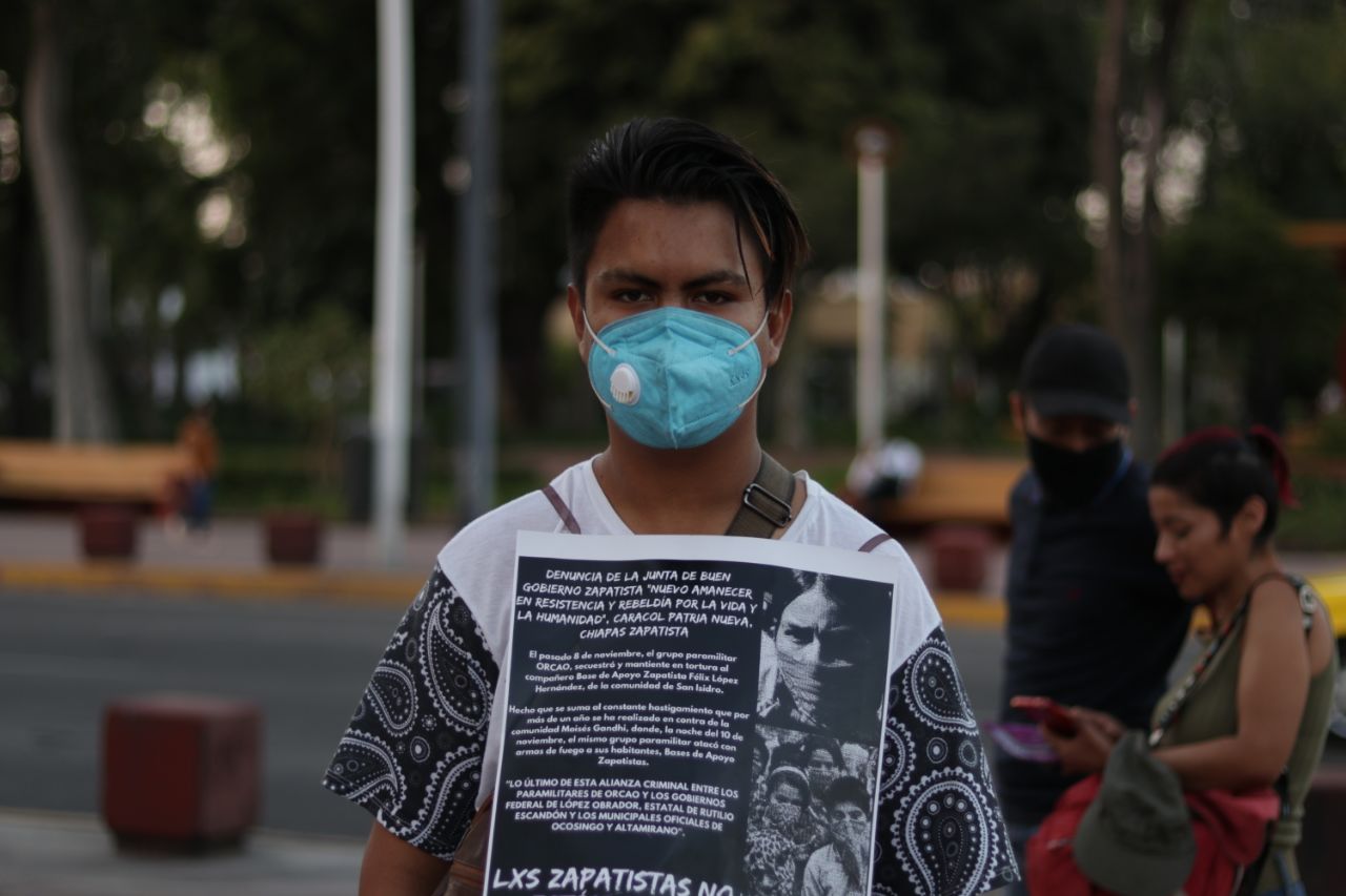 En punto de las 5:00 p.m. este jueves 12 de noviembre, personas solidarias adherentes a la Sexta se reunieron en el Parque Rojo para demandar ¡alto! a las agresiones que recientemente han sufrido las comunidades zapatistas en Chiapas por el grupo paramilitar ORCAO.