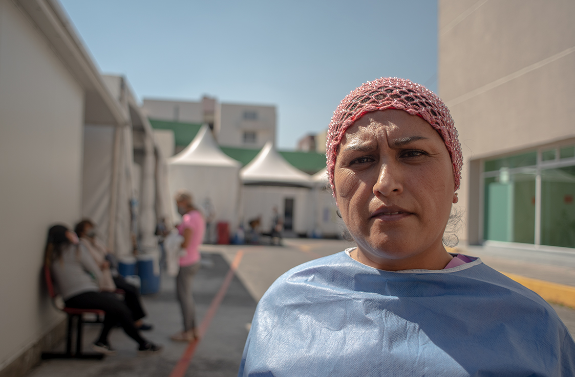María Eugenia Rojas Rangel se traslada todos los días en camión a su trabajo, los pasajeros del colectivo no saben que es enfermera. Cuando comenzó a trabajar tenía veinte años, entonces ganaba 1 mil 500 pesos a la quincena. Hace 10 años que trabaja en el Hospital General Ajusco Medio, que hoy es sanatorio covid. Actualmente gana 11 mil 500 pesos al mes. A pesar de su antigüedad y especialización quirúrgica, no tiene seguro contra riesgos ni contrato base. El invierno se acerca y la posibilidad de que las autoridades sanitarias consideren regresar al semáforo rojo le preocupa, además de la constante amenaza del retiro de insumos por parte de la institución.