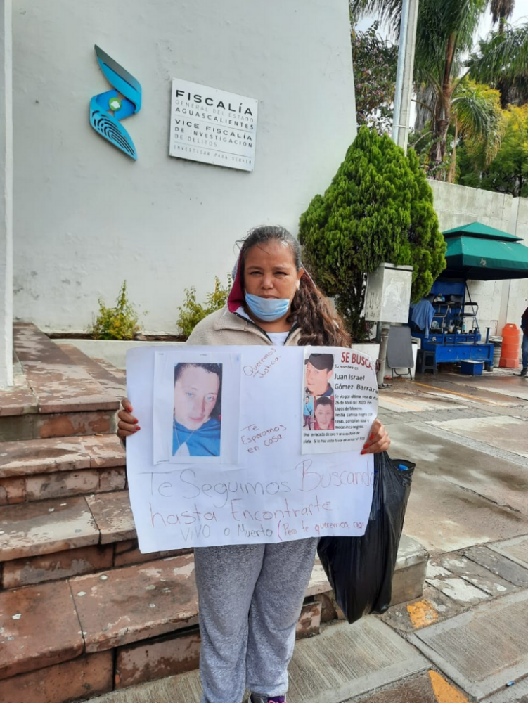 María Zenaida Barrasa busca a su hijo, Juan Israel Gómez Barrasa, un muchacho de 20 años con ojos azul claro intenso, desapareció el 26 de abril del 2020 en Lagos de Moreno. Juan salió a comprar el desayuno y no regresó. Esta es la primera vez que María Zenaida visita Aguascalientes y el primer lugar que conoció fue la morgue.