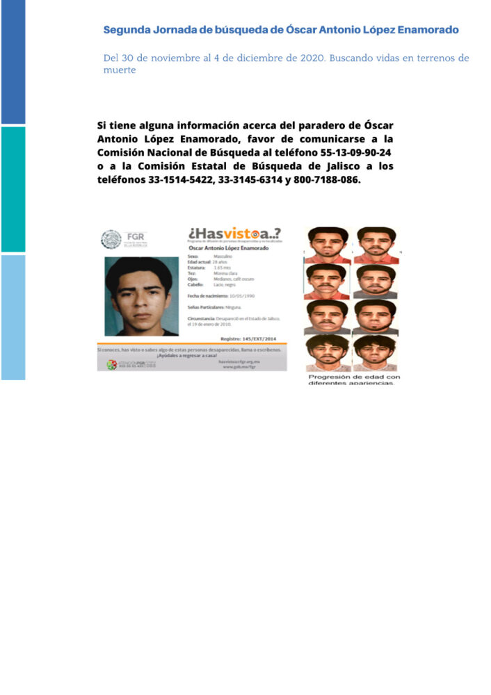 Además, informó que nuevamente las labores de búsqueda estuvieron acompañadas de autoridades estatales y federales, como: la Comisión Nacional de Búsqueda, la Comisión Local de Búsqueda del Estado de Jalisco, la Comisión Nacional de Derechos Humanos, la Comisión Ejecutiva Estatal de Atención a Víctimas del Estado de Jalisco, la Guardia Nacional, así como, diversas policías municipales, de quienes prefirió reservar su origen por seguridad.
