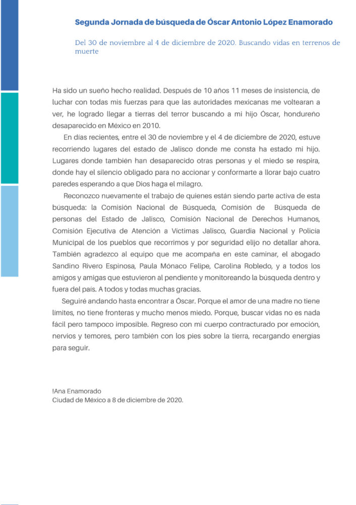 Del 30 de noviembre al 4 de diciembre, Ana Enamorado, defensora de derechos humanos, integrante del Movimiento Migrante Centroamericano y madre incansable de Óscar Antonio López Enamorado, joven hondureño desaparecido en Jalisco en el año 2010, llevó a cabo la segunda jornada de búsqueda por su amado hijo en territorios de Jalisco.