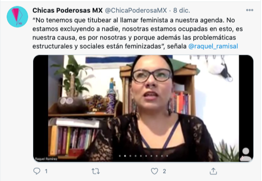 Durante el conversatorio, Raquel Ramírez Salgado, doctora en ciencias políticas de la Universidad Nacional Autónoma de México (UNAM) apuntó que recientemente se ha conseguido visibilizar el feminismo en medios, gracias a mujeres feministas que han trascendido cualquier estereotipo sexista en estos espacios; no obstante, precisó que, todavía existen narrativas que no representan a las mujeres, muchas de éstas aún presentes en la publicidad y en ciertos contenidos de la televisión como las novelas, etc.
