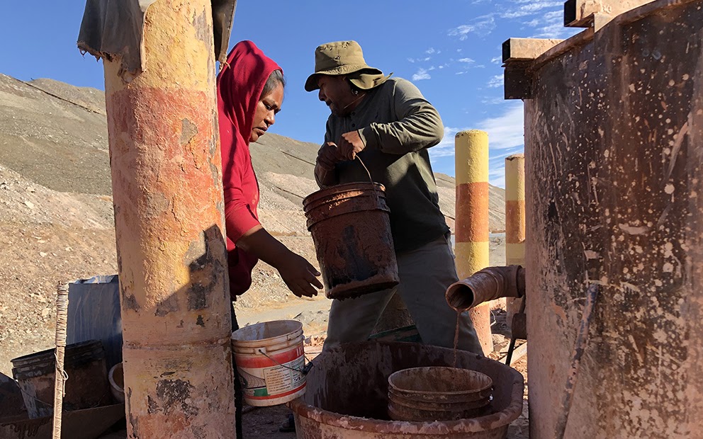Aquí falta todo, la comida y el agua. Los ejidatarios traen combustible de Puerto Peñasco todos los días, sólo así pueden seguir con la molienda de las piedras que recogen con la ayuda de un plato y mercurio para encontrar los metales.