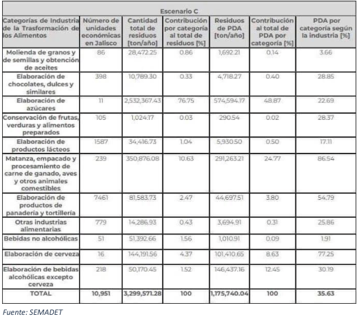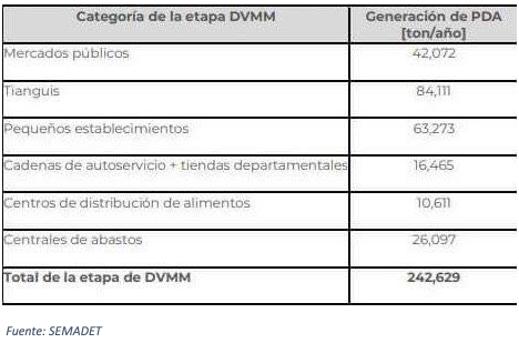 La SEMADET estimó que los Servicios Alimentarios en Jalisco generan alrededor de 300 mil toneladas al año de PDA, donde el 70.5 por ciento es comestible, considerando líquidos y sólidos por igual. Empero, si no se consideran los líquidos sería del 57 por ciento.