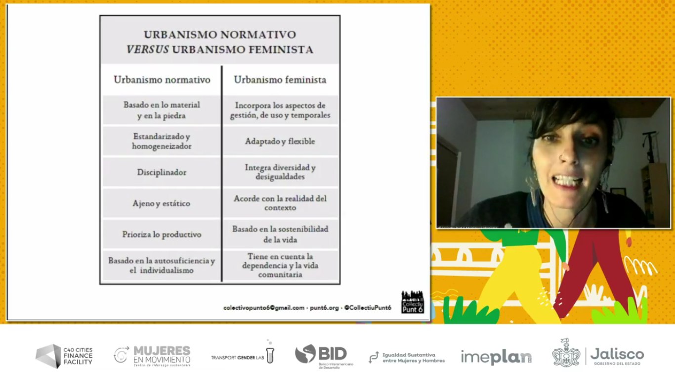 En acuerdo a ese análisis, Blanca Valdivia de Col-lectiu Punt 6, propuso las diferencias entre el urbanismo normativo y aquel que permite ciudades feministas. Mientras el normativo es disciplinador (sic), prioriza lo productivo, ajeno y estático, el feminista integra las diversidades y desigualdades, se basa en la sostenibilidad de la vida y es flexible para adaptarse a la realidad del contexto.