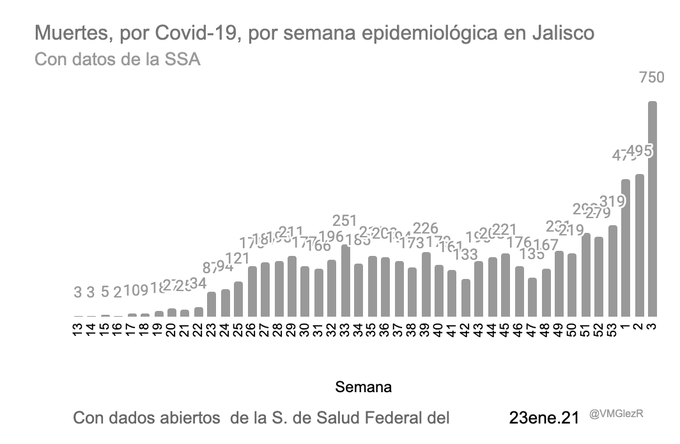 En datos acumulados, al 24 de enero, 7 mil 807 personas han perdido la vida por COVID-19 en la entidad (en el país son ya 65 mil 790 decesos); sin embargo, estas muertes podrían aumentar, pues Jalisco es de las entidades en el país que han registrado un exceso de mortalidad durante la actual pandemia, pues -hasta la semana 41 del año pasado-, el exceso de mortalidad era del 28 por ciento.