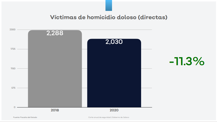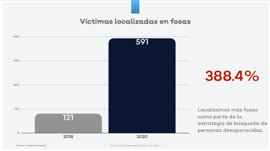 El gobernador de Jalisco también informó sobre un aumento de 388.4% en el número de víctimas encontradas en fosas clandestinas; sin embargo, aseguró que el incremento se debe a las labores de búsqueda ejecutadas por la Fiscalía del Estado y la Fiscalía Especial en Personas Desaparecidas.