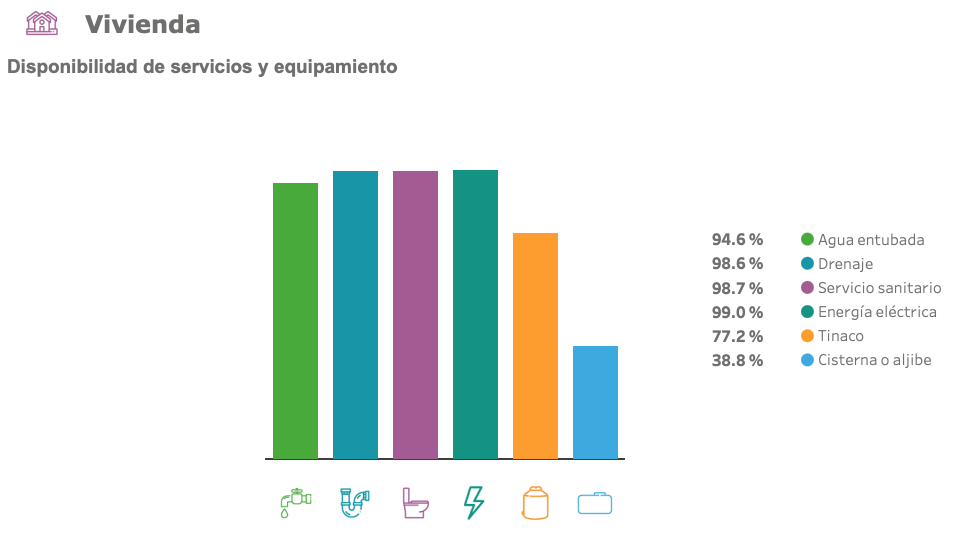 Los habitantes por vivienda son 3.6 personas. La mayoría de estas viviendas cuentan con todos los servicios y al 2020, sólo el 1.5% tiene piso de tierra.