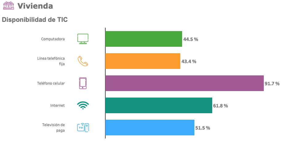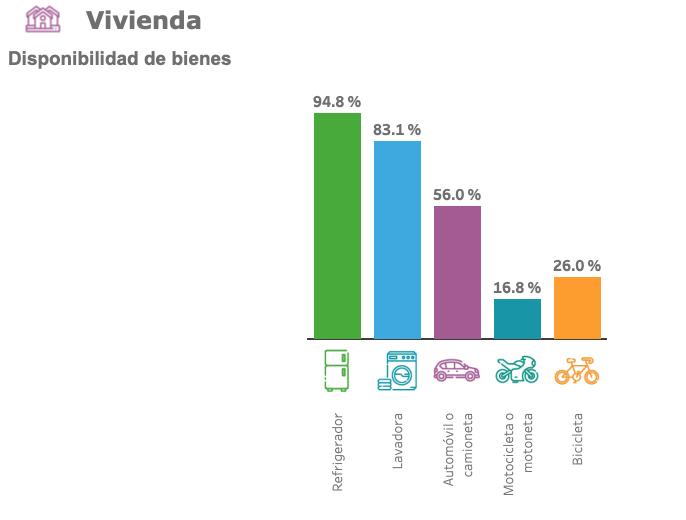 En cuanto a la posesión de bienes y servicios, aquí están los resultados; destaca que más de la mitad de los hogares tienen vehículo y en cuanto las posesiones tecnológicas, más del 90% tiene uno o más teléfonos celulares.