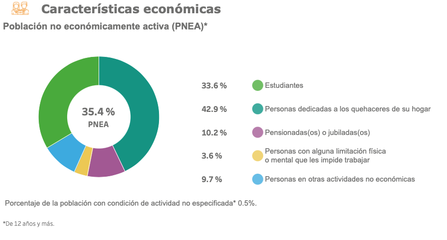 Finalmente, en matería económica el 64.1% de la población es económicamente activa, y quienes no lo son se subdividen así:
