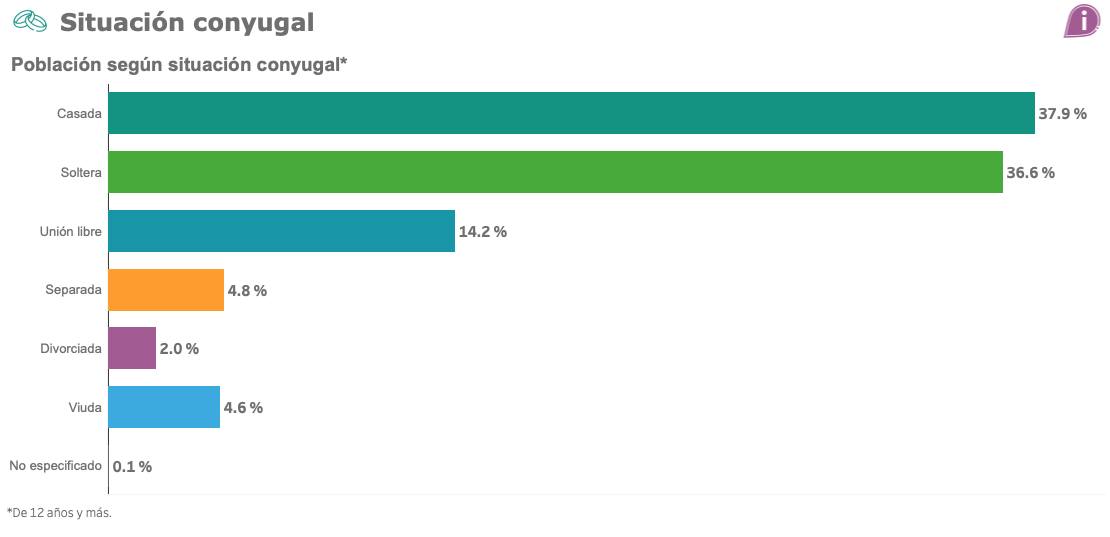 En cuanto a la situación conyugal, el 37.9% de los jaliscienses están casados; mientras que el 14.2% viven en unión libre.
