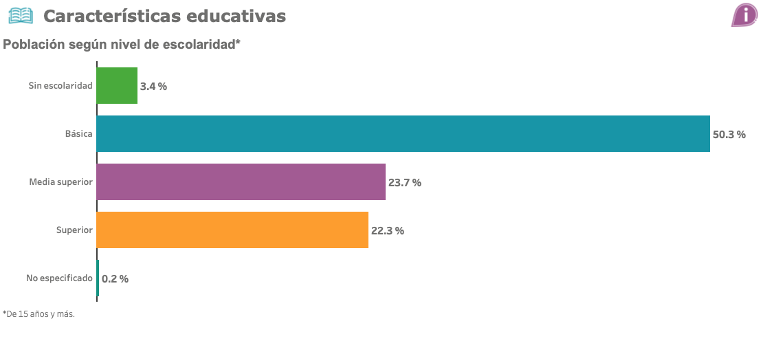 El nivel de escolaridad en Jalisco está en la educación básica que ha sido estudiada por el 50.3% de la población; en contraparte, sólo el 3.4% de la población son analfabetas.