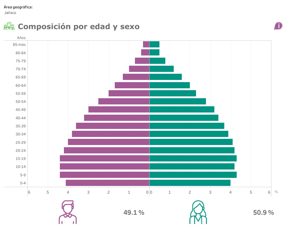 El 62% de la población jalisciense viene en el Área Metropolitana (5 millones 242 mil 392 personas), siendo Zapopan y Guadalajara, los municipios más poblados.