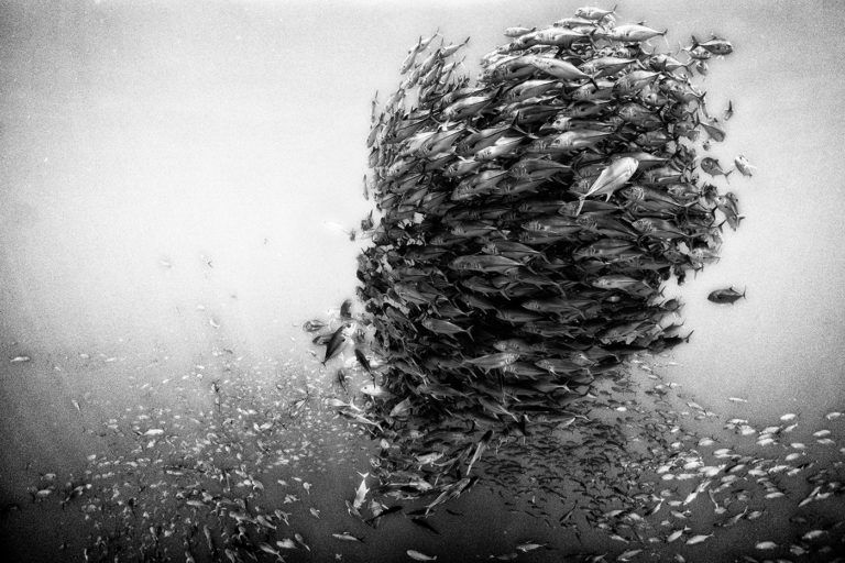 Patjane fotografía el mar en blanco y negro porque “el color en muchos de los casos es un distractor y no un elemento que fortalece la composición”. Con sus imágenes, asegura, intenta dirigir la atención hacia la belleza de los océanos y hacia la forma en la que consumimos los recursos que ofrece el mar. “Vemos y nos preocupamos cuando un bosque desaparece porque es visible para todos, pero no vemos cuando destruimos la vida bajo el agua. No vemos cómo las redes del atún, la industria camaronera y los barcos balleneros causan daños y muerte. No estamos familiarizados con este entorno porque no vemos lo que destruimos y esto debe cambiar muy rápido para que podamos revertir este curso”, señala.