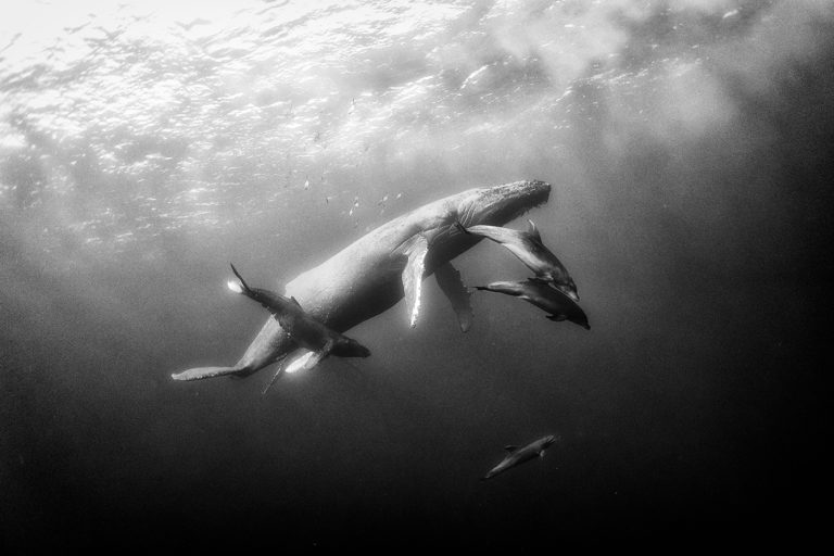 Ha habido varias. Una muy especial ocurrió en Roca Partida, Revillagigedo, en un buceo en el que nos topamos con una madre ballena con su ballenato. Durante un buen rato un grupo de delfines se acercó a ellos y estuvieron interactuando con el ballenato de un modo muy curioso. Cuando la cría salía a la superficie a tomar aire, los delfines seguían sus movimientos de cerca, imitándolo y la madre tranquilamente permitía este juego, observando. Presenciar este espectáculo y fotografiarlo es de los mejores regalos que me ha dado el mar.