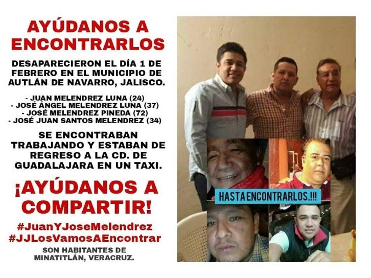Hoy se cumplen tres años de que Juan y José Ángel Meléndrez Luna; así como José Juan Santos Meléndrez y José Meléndrez Pineda fueran víctimas de desaparición forzada a manos de policías municipales del Autlán de Navarro, Jalisco.