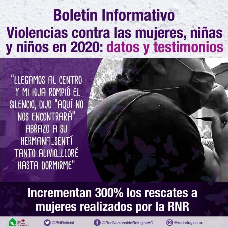 Según informó la RNR, durante 2020 las labores de rescate de mujeres, niñas y niños en contextos de violencia aumentaron un 300%, esto en comparación con el 2019; Ciudad de México, Estado de México y Puebla fueron las entidades con mayor número de casos. Al mismo tiempo, acompañaron de forma especializada a 15 mil 692 personas en redes sociales y líneas telefónicas, reflejando un aumento del 31% respecto al 2019.