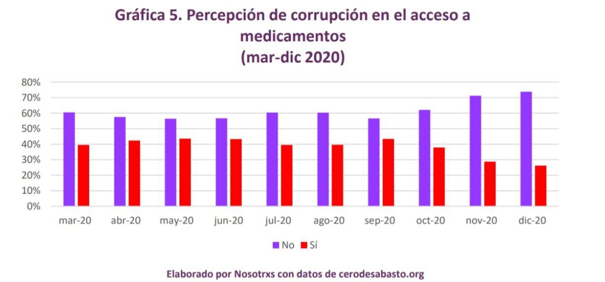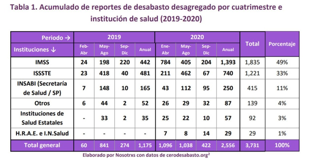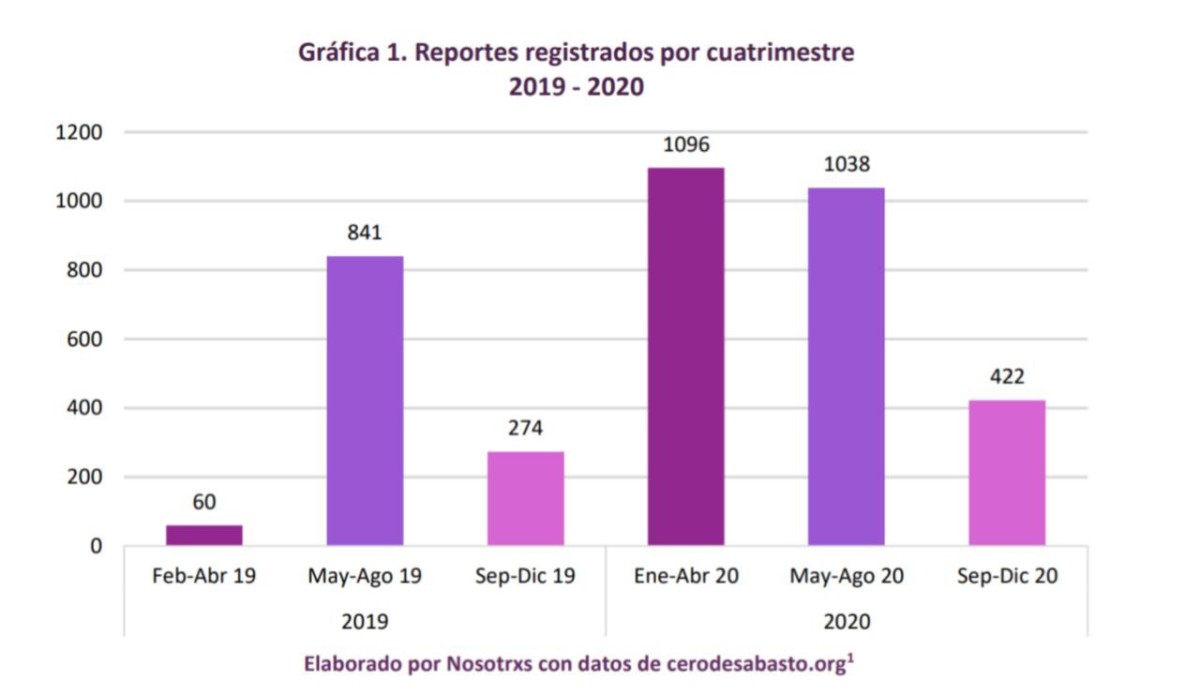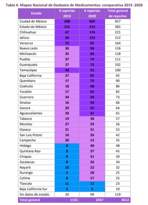 El informe del colectivo Cero Desabasto: Mapeo Nacional de Desabasto de Medicamentos, compiló los reportes de familiares, pacientes y profesionales de salud, que se unieron para visibilizar el problema de desabasto de medicamentos en México en el año 2020. De acuerdo con los resultados arrojados, durante los primeros 8 meses del año pasado, hubo un incremento en los reportes comparado con el año 2019, aun cuando las atenciones a pacientes con COVID-19 disminuyeron considerablemente
