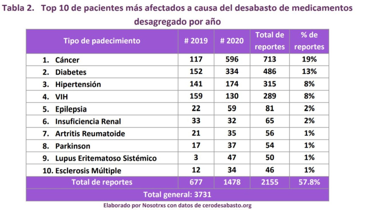 Las enfermedades más afectadas a causa del desabasto de medicamentos en 2020, fueron: cáncer, -con un aumento de casos de no surtimiento-, diabetes, lupus, epilepsia e hipertensión