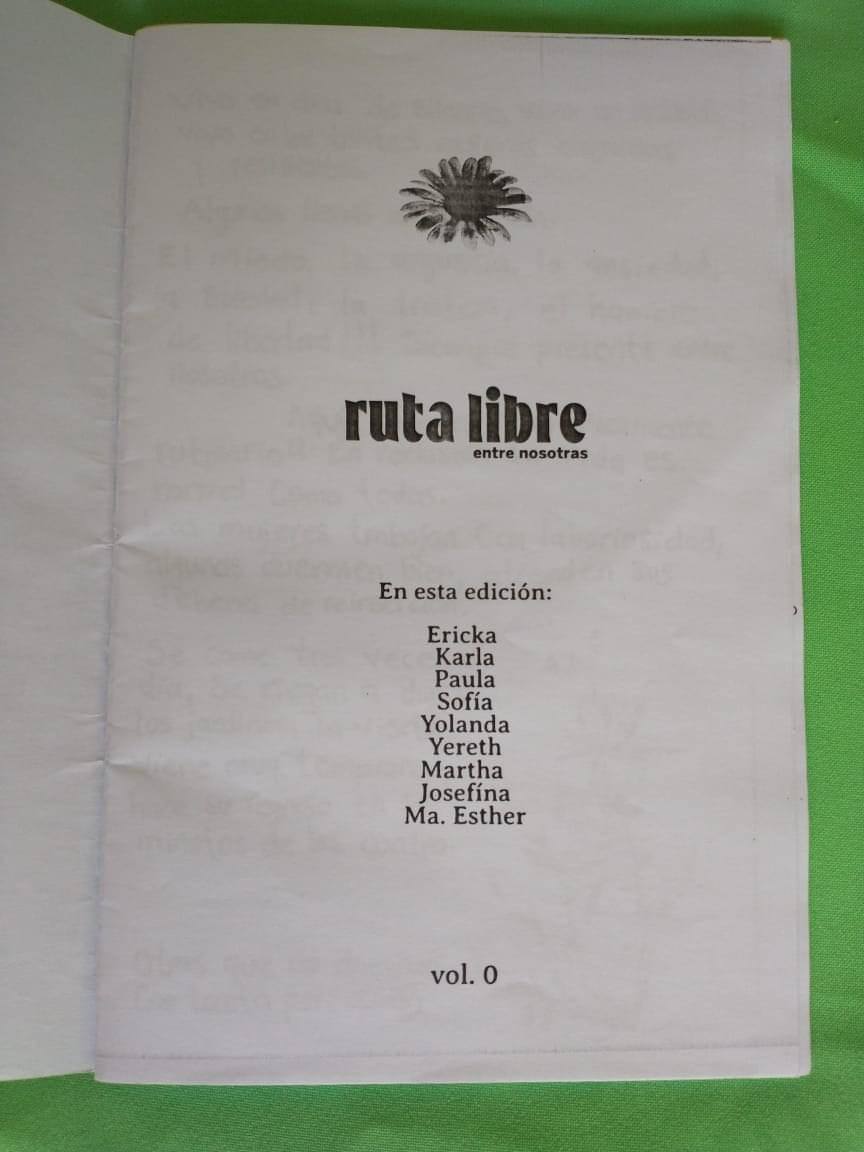 Ericka, Karla, Paula, Sofía, Yolanda, Yareth, Martha, Josefina y Ma. Esther son las autoras de los poemas, reflexiones, pensamientos, consejos, frases motivacionales y recetas que aparecen en el volumen 0 de “Ruta Libre entre nosotras”, un fanzine mensual elaborado por mujeres privadas de la libertad en el Centro de Reinserción Femenil de Puente Grande, Jalisco.