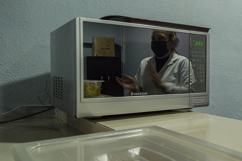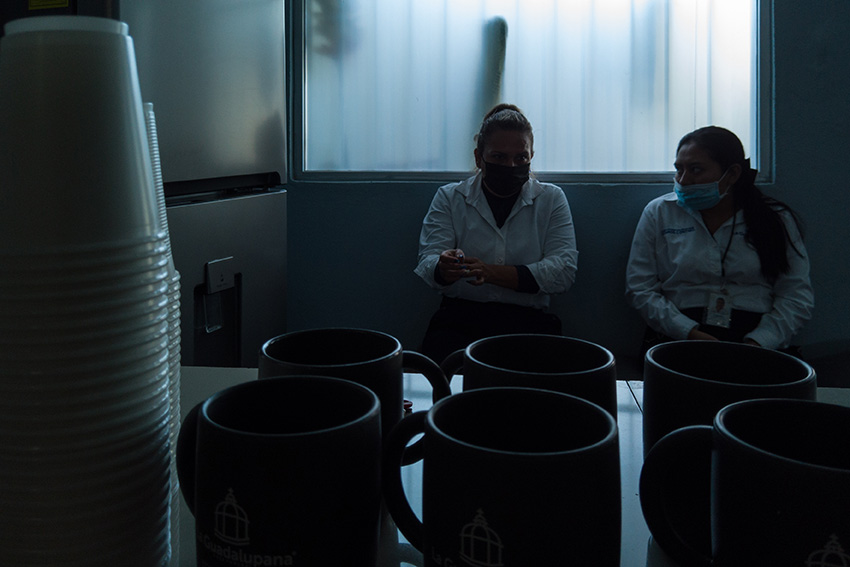 Mira su teléfono y dice: “Ya falta menos, hay que resistir”. La capilla se sanitiza después de que sale una familia, pero constantemente rocía sanitizante en aerosol en las manijas de las puertas, las mesitas y en lo que toca ella toca, se le observa lavarse las manos, recoger la basura de los botes y tener rellena la cajita de pan que ofrece junto al café.