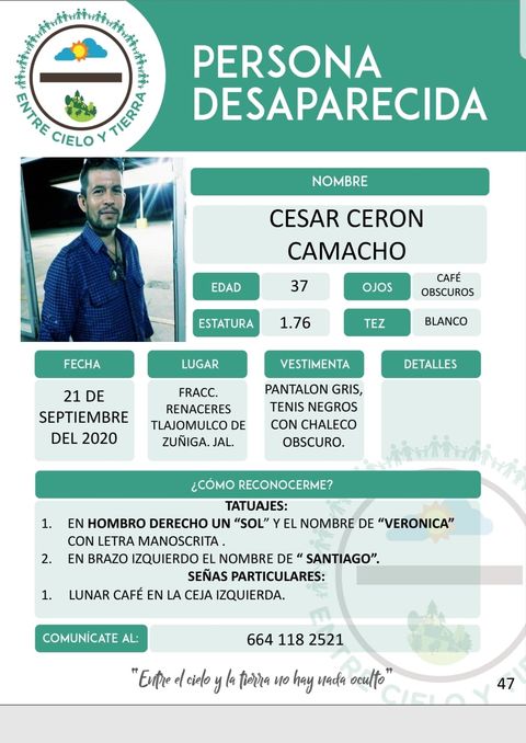 César Cerón Camacho fue desaparecido el 21 de septiembre de 2020 en el fraccionamiento Renaceres en Tlajomulco de Zúñiga, Jalisco, luego de que los hombres que lo habían extorsionado decidieron llevárselo después de que éste les pagara los 10 mil pesos que le pidieron para no hacerle nada a su familia.
