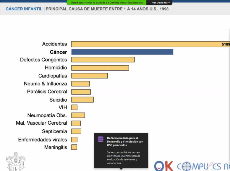Junto con el área de Desarrollo y Vinculación con Organizaciones de la Sociedad Civil del gobierno del estado, José Carlos Izaguirre Zabala, representante de Cómplices A.C, reconoció que el cáncer infantil es la segunda causa de muerte en México, sólo después de los accidentes.