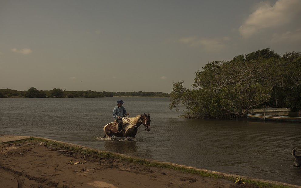 Un hombre cabalga dentro de la Laguna de Alvarado, en una comunidad aledaña a Puquita, islote de mangle tropical donde fueron localizadas fosas clandestinas. Foto: Felix Márquez