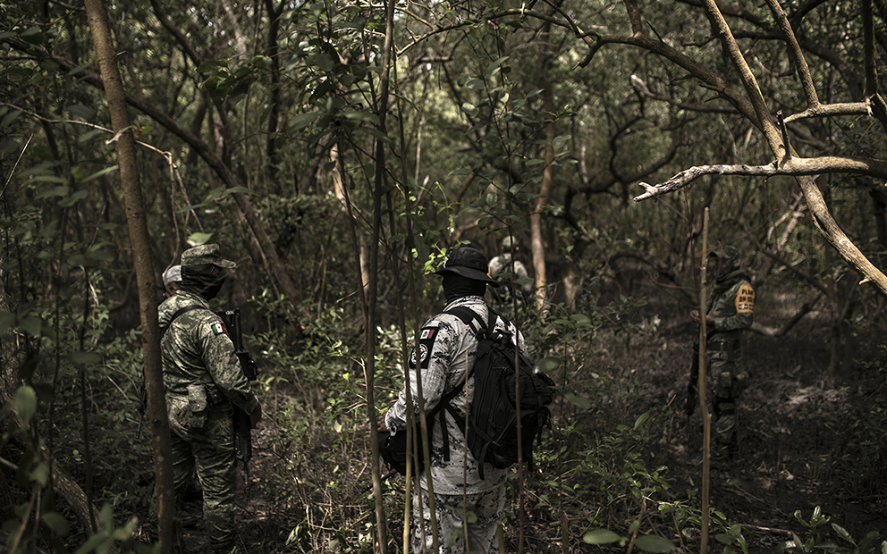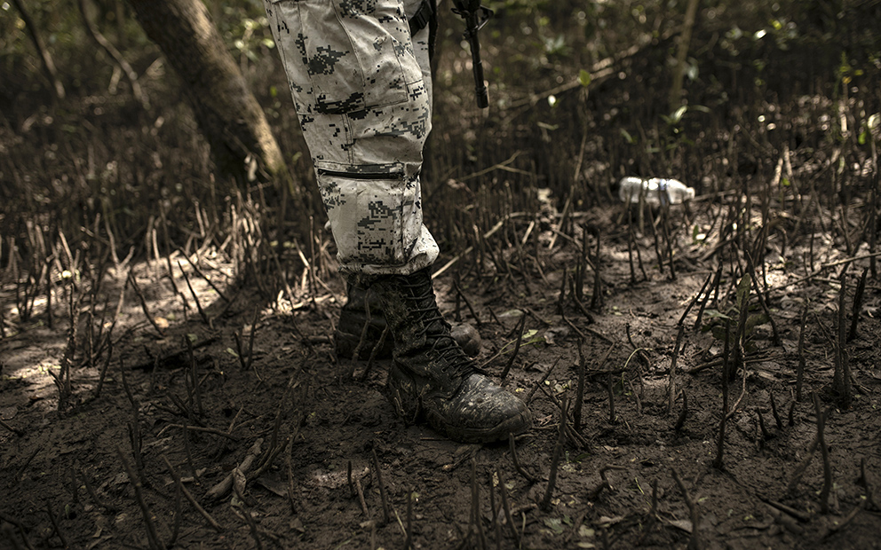 Las siluetas de hombres uniformados se asoman entre las raíces del bosque de mangle, apenas iluminadas por el sol que se filtra en la copa de los árboles, el ruido se pierde con el viento del norte que sopla al mediodía.