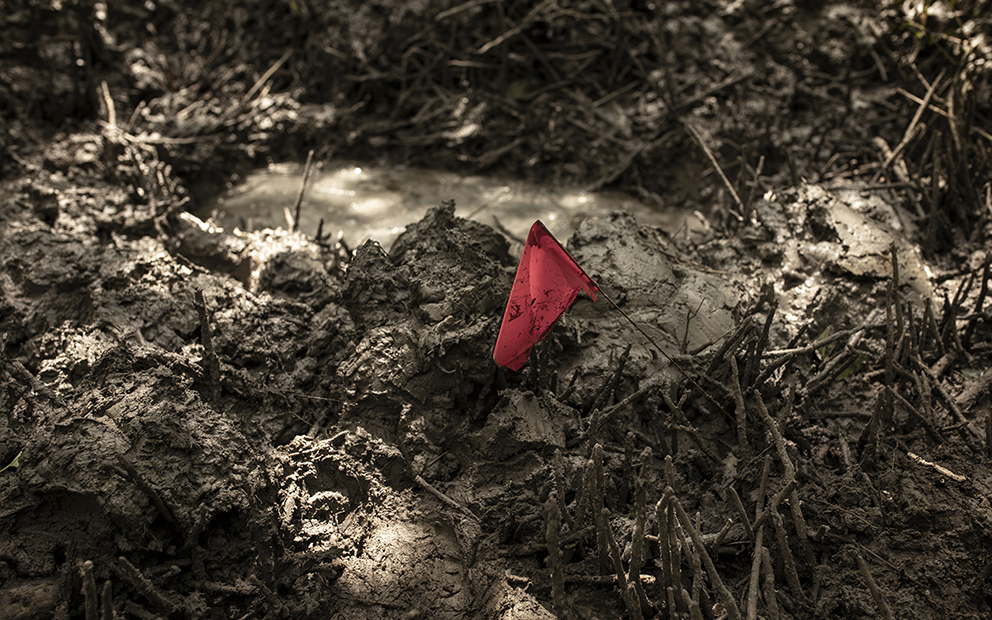 Una fosa clandestina es marcada con una bandera roja en el islote Puquita, perteneciente al sistema lagunar de Alvarado, donde fueron localizadas fosas clandestinas por parte de la Comisión Nacional de Búsqueda, el lugar fue asegurado por el Ejército Mexicano y la Guardia Nacional. Foto: Felix Márquez.