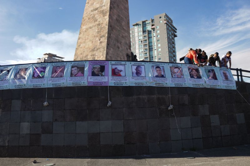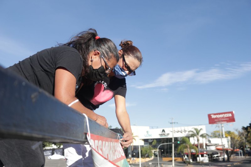 Integrantes del Colectivo Altos Sur “En busca de ti” colocando sus lonas de búsqueda en la Glorieta de las y los desaparecidos de Jalisco (Foto: Christian Cantero).