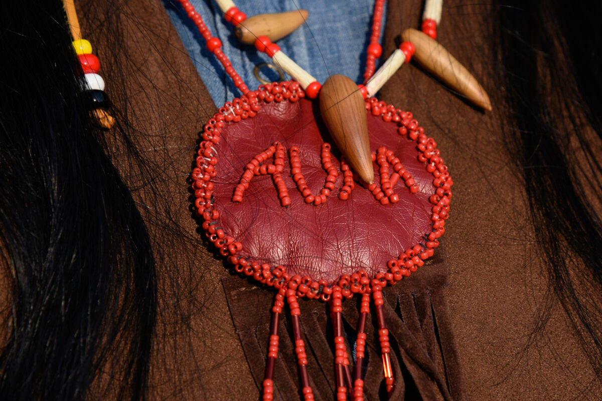 Norma Meza porta un collar con la palabra “Auka”, saludo tradicional kumiai