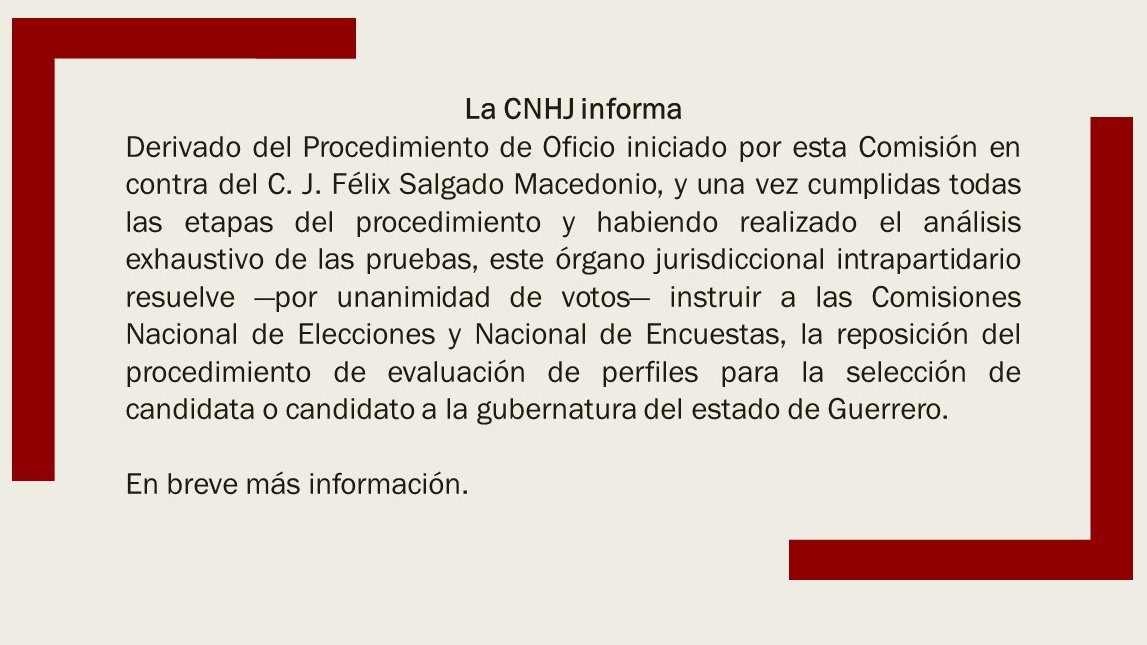 A través de un tuit contradictorio publicado el 26 de febrero, la Comisión Nacional de Honestidad y Justicia (CNHJ) de Morena instruyó a las comisiones de Elecciones y de Encuestas la reposición del procedimiento de evaluación de perfiles para la selección de candidato a la gubernatura, con lo que Salgado Macedonio dejaría de ser candidato a gobernador.