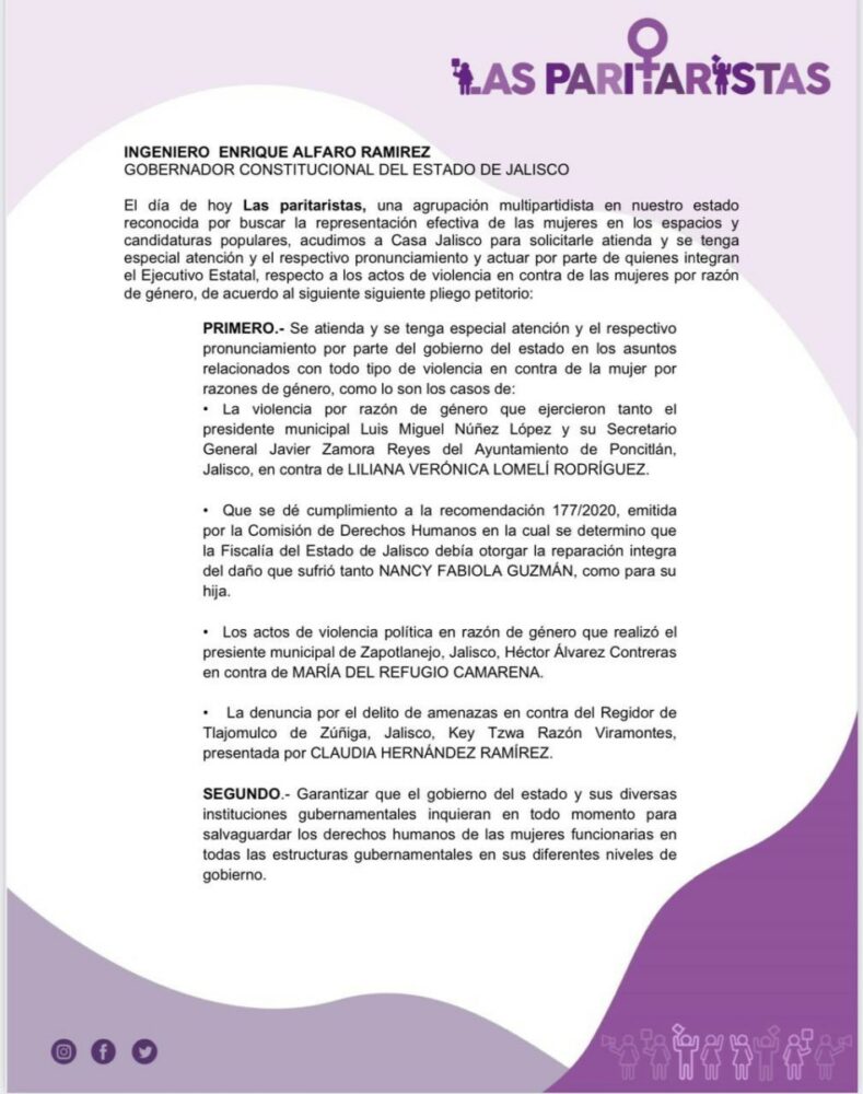 Con el fin de exigir que sean atendidos con diligencia y conforme a derecho, los casos existentes de violencia política y de género dentro de las instituciones gubernamentales del estado, mujeres integrantes de la agrupación multipartidista Las Paritaristas, clausuraron de manera simbólica Casa Jalisco, y exigieron al gobernador Enrique Alfaro que en 48 horas emita una respuesta a sus demandas, puesto que, éste no salió a recibirlas.