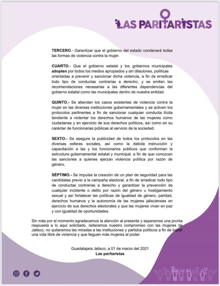 “Las mujeres candidatas se están sintiendo valientes en vez de seguras al salir a las calles. Más de 9 mil mujeres van a estar en las calles pidiendo participar, pidiendo su voto. Necesitamos garantía para ellas y para cada una de las mujeres”, demandaron al gobernado, Enrique Alfaro, las integrantes de la agrupación Las Paritaristas en la clausura simbólica de Casa Jalisco, este lunes 1 de marzo.