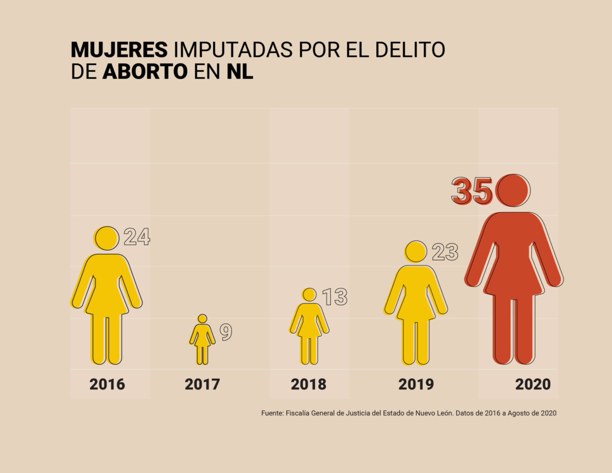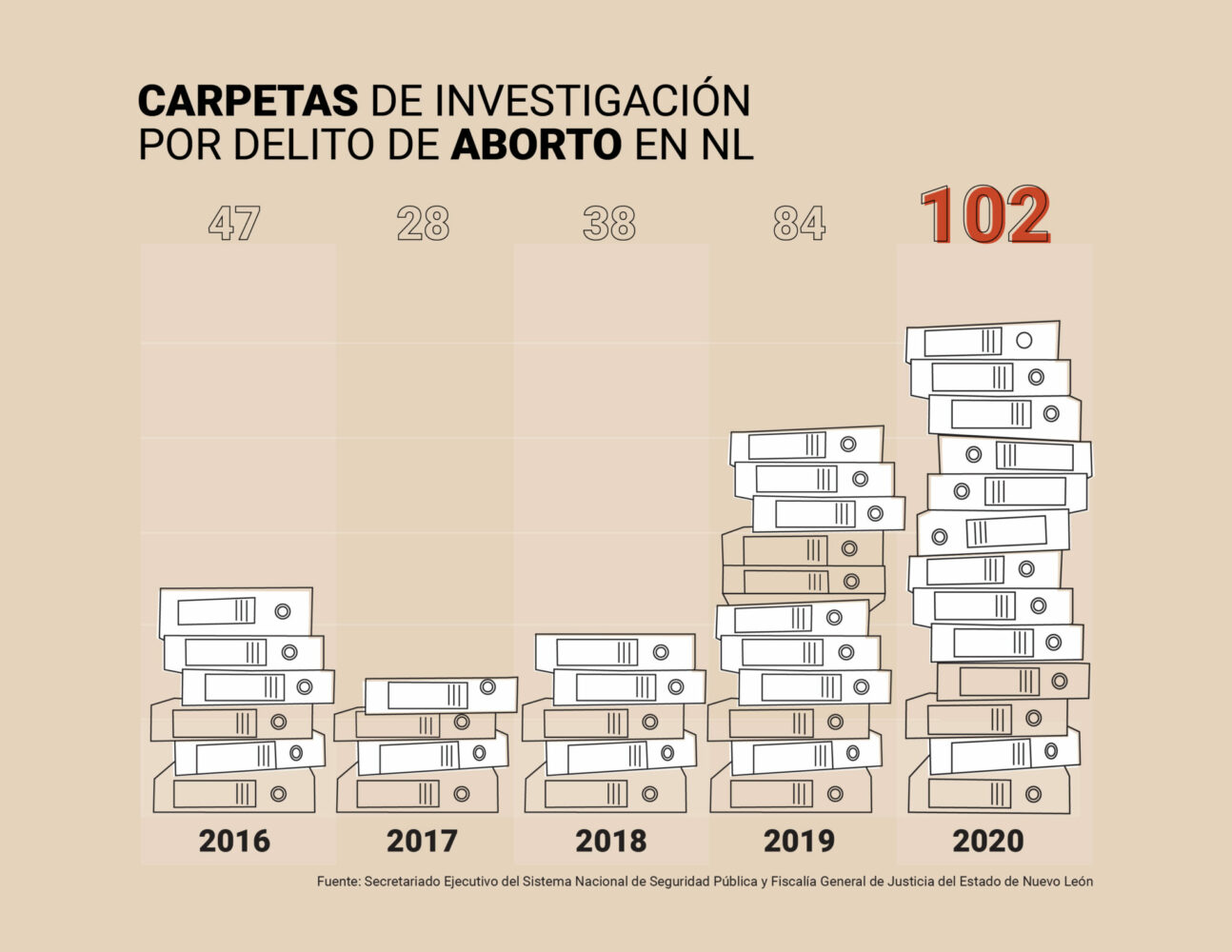 En 2020, Nuevo León se convirtió en el segundo estado a nivel nacional con más carpetas de investigación abiertas por el delito de aborto, sólo por detrás del Estado de México, que tiene 145, según datos del Secretariado Ejecutivo del Sistema Nacional de Seguridad Pública (SESNSP). La Fiscalía General de Justicia del Estado impuso una marca con 102 carpetas abiertas por este delito.