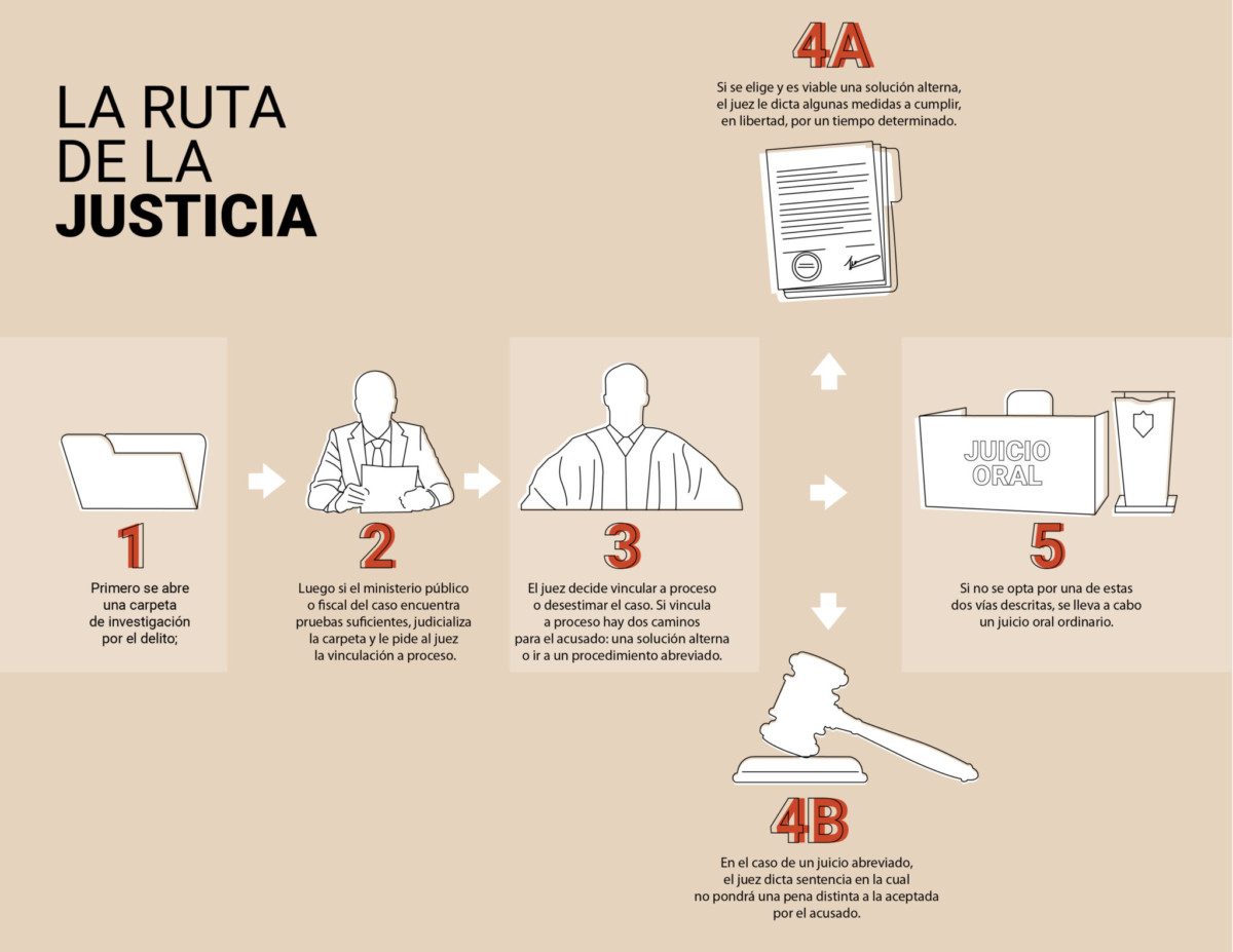 Los términos de un proceso legal pueden confundir a cualquiera que no sea abogado, pero explicado de manera simple, el sistema de justicia penal funciona así: primero se abre una carpeta de investigación por el delito; luego si el ministerio público o fiscal del caso encuentra pruebas suficientes, judicializa la carpeta y le pide al juez la vinculación a proceso. El juez decide vincular a proceso o desestimar el caso. Si vincula a proceso hay dos caminos para el acusado: una solución alterna o ir a un procedimiento abreviado. Si se elige y es viable una solución alterna, el juez le dicta algunas medidas a cumplir, en libertad, por un tiempo determinado. En el caso de un juicio abreviado, el juez dicta sentencia en la cual no pondrá una pena distinta a la aceptada por el acusado. Si no se opta por una de estas dos vías descritas, se lleva a cabo un juicio oral ordinario.