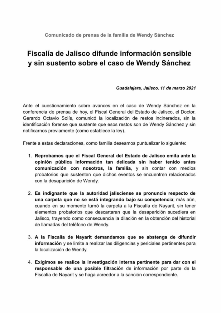 “Reprobamos que el Fiscal General de Jalisco emita ante la opinión pública información tan delicada sin haber tenido antes comunicación con nosotros, la familia, y sin contar con medios probatorios que sustenten que dichos eventos se encuentren relacionados con la desaparición de Wendy”, se lee en el comunicado que la familia de Wendy Sánchez Muñoz difundió en redes sociales, luego de que el Fiscal General de Jalisco, Gerardo Octavio Solis, dijera que había información sobre el hallazgos de restos incinerados que podrían vincularse con su desaparición.