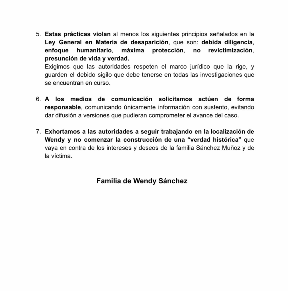 “Exhortamos a las autoridades a seguir trabajando en la localización de Wendy y no comenzar la construcción de una verdad histórica que vaya en contra de los intereses y deseos de la familia Sánchez Muñoz y de la víctima”.