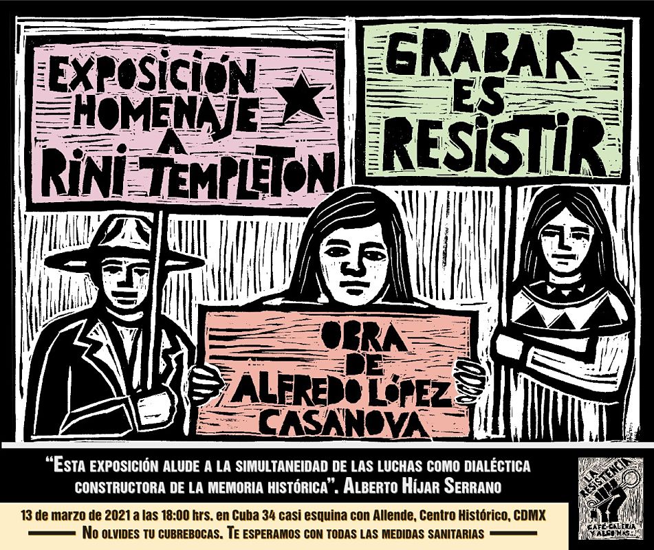 Así mismo, Grabar es resistir además es una exposición- homenaje permanente a Rini Templeton, que se inaugurará el 13 de marzo de 2021 a las 18 hrs en La Resistencia, Café-Galería, ubicada en Cuba 34 casi esquina con Allende Centro Histórico de la Ciudad de México. La muestra durará hasta el 13 de abril. Con esta exposición se arrancan la actividades de esta café-galería.