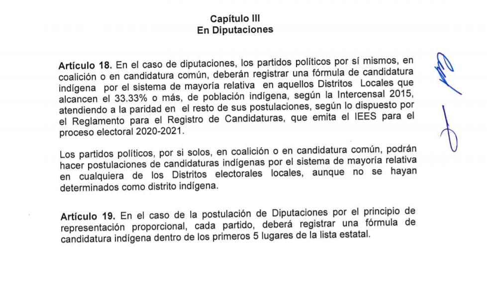 El Instituto Estatal Electoral de Sinaloa emitió un acuerdo en el que establece que todos los partidos políticos deben incluir a una persona indígena entre las primeras cinco posiciones de candidaturas de representación proporcional, conocidas como plurinominales.