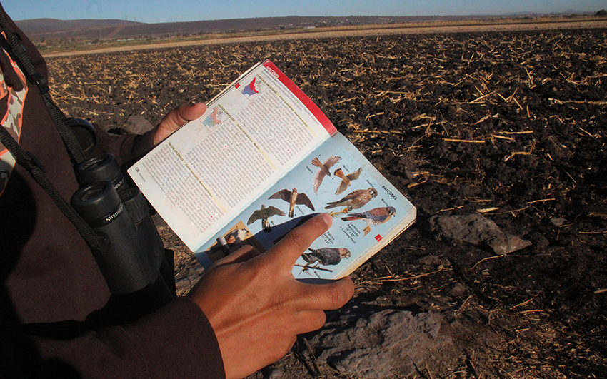 Efrén dirige un grupo de pajareros, como se llaman a quienes se dedican a la actividad de mirar las aves, registrarlas, seguir sus migraciones. A lo largo del año acuden a los cuerpos de agua temporales, a los cerros y sembradíos, también a los parques públicos y colonias arboladas a hacer el registro.
