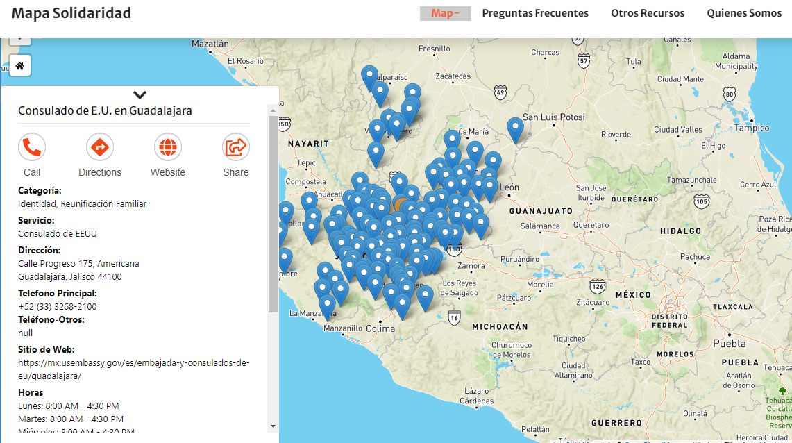 Diversas organizaciones binacionales y translocales en México y Estados Unidos se organizaron para crear el “Mapa Solidaridad”, una plataforma que facilita a personas migrantes en tránsito, indocumentadas, refugiadas, retornadas, deportadas y a las organizaciones que les acompañan, a ubicar servicios y dependencias de ayuda de acuerdo a sus necesidades prioritarias: consulados, embajadas, albergues, hospitales, secretarías del trabajo, secretarías de atención a la familia y asistencia legal, en cualquier estado y/o ciudad de ambos países.