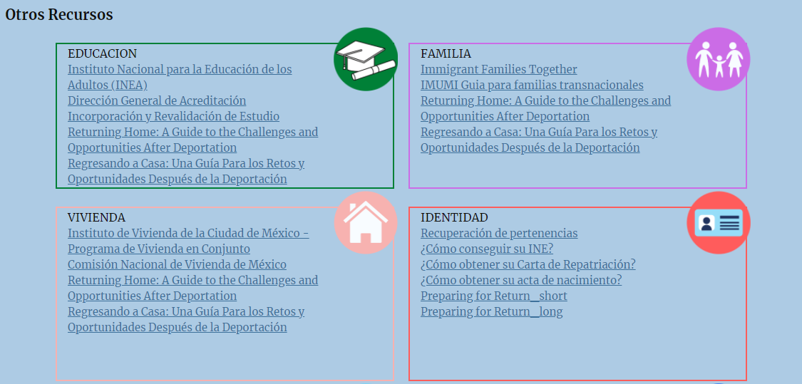 Se trata de un “sitio web vivo”, reconoció el colectivo de organizaciones en red a cargo del proyecto, conformado por: Deportados Unidos En La Lucha Comunidad en Retorno; Chicago Community and Workers’ Rights; Otros Dreams en Acción, ODA; y Loyola University Chicago, pues advirtieron que continúa nutriéndose y expandiéndose en virtud de las experiencias y requerimientos de las personas migrantes y sus acompañantes.