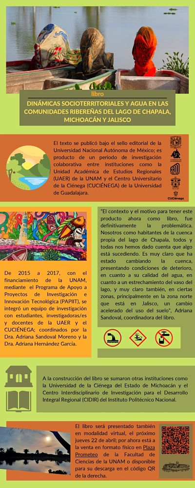 El libro Dinámicas socioterritoriales y agua en las comunidades ribereñas del Lago de Chapala, Michoacán y Jalisco, se publicó en septiembre de 2020, bajo el sello editorial de la Universidad Nacional Autónoma de México. Fue resultado de un proyecto de investigación entre la UAER de la UNAM y el Centro Universitario de la Ciénega de la Universidad de Guadalajara.